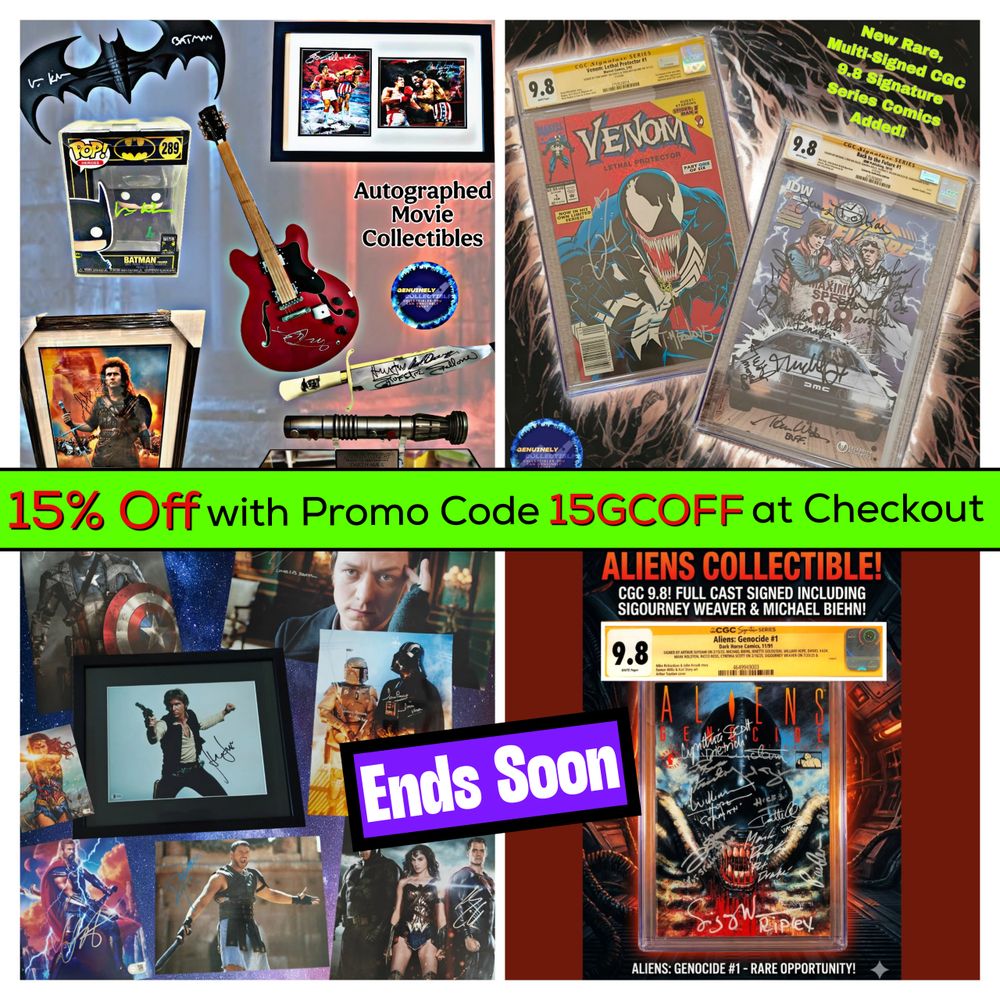 Discover authentic, autographed movie collectibles at Genuinely Collectible, a family-run business offering hand-curated items. Our extensive collection features genuine photos of every product, ensuring transparency and trust. Explore our unique selection, including rare hand-signed sets, autographed movie posters, celebrity photos, prop replicas, trading cards, statues, figures, Funko pops, and exclusive CGC signature series comics. Our loyal clientele spans the globe, drawn back by our trustworthiness, customer service, and diverse secure payment options, including PayPal.